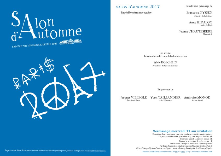 Fort de trois grandes personnalités, Jacques Villeglé, parrain de cette 114ème édition, Yvon Taillandier invité d’honneur, et Amboise Monod artiste-invité, le Salon d’Automne 2017 a voulu être le lieu de la Rencontre : la rencontre entre des Arts, des artistes, des professionnels du monde l’art, mais surtout, la rencontre entre les Arts et son public.