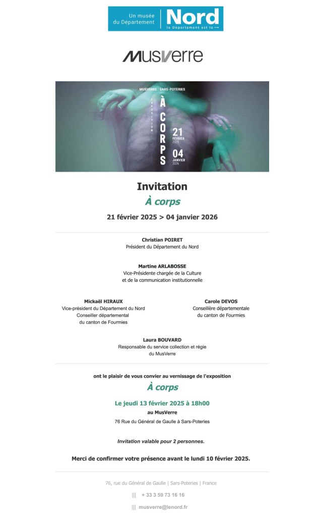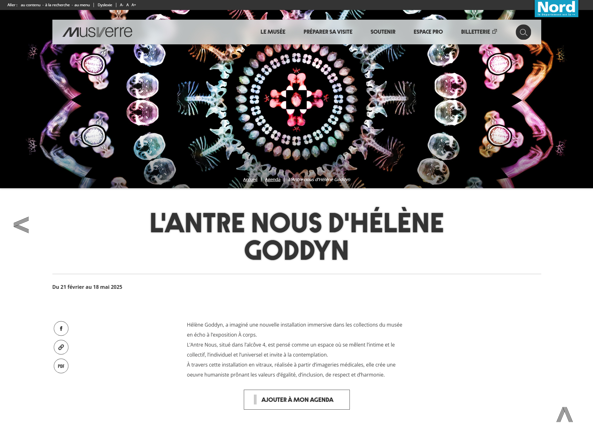 Le MusVerre m’a invitée, du 21 février au 18 mai 2025, à créer une installation immersive, visuelle et sonore, spécialement conçue pour l’exposition thématique –À corps– et liée à l’architecture du musée. Exposition temporaire du 21 février 2025 au 4 janvier 2026.